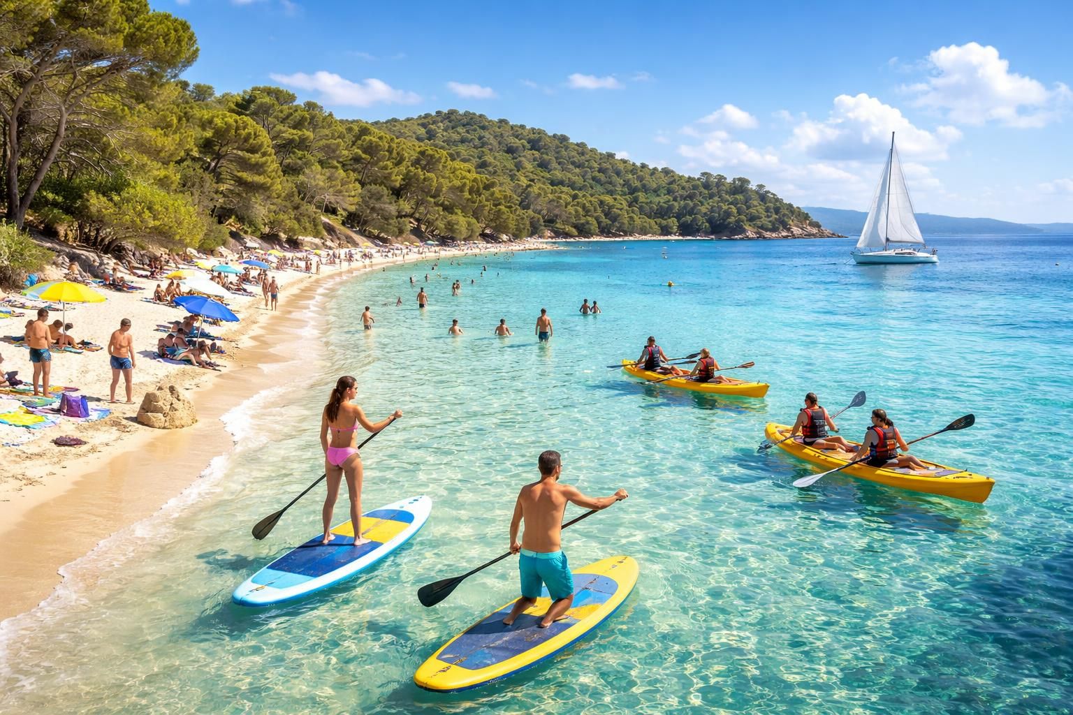Le kayak de mer et le paddle sont d’autres activités nautiques populaires sur cette plage. Les eaux calmes et turquoise offrent des conditions idéales pour naviguer à la découverte de criques isolées. Louer un kayak ou une planche de paddle à Porquerolles vous permet d’explorer certaines parties moins fréquentées de l’île. Que ce soit en solo ou en groupe, ces excursions en mer sont l’occasion d’apprécier des vues imprenables sur le littoral, dont l’attrait est inégalé.